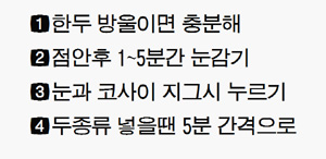 다만 수술 환자는 상처에 닿을 수 있으므로 누르지 않는 것이 좋다. 안약을 두 가지 이상 넣을 때는 약이 희석되지 않게 5분 정도 시간차를 둔다. 흘러나온 점안액은 청결한 거즈나 티슈 등으로 가볍게 닦아준다. 눈 안에 연고를 넣을 때도 마찬가지다. 아래 눈꺼풀을 아래로 잡아당긴 후 안연고를 3~4㎜ 정도를 결막낭에 넣어주면 된다. 안약을 많이 넣어야 할 때도 있지만 대개 한두 방울만 정확히 점안해도 그 효과가 충분하다.