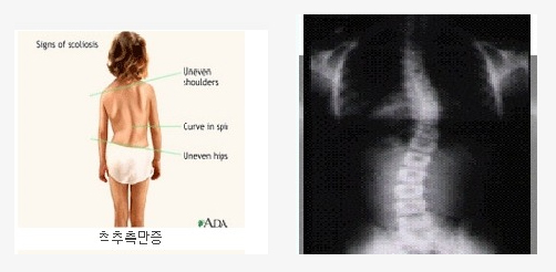 척추측만증은 해부학적인 정 중앙의 축으로부터 척추가 측방으로 만곡 또는 편위되어 있는 기형적인 상태로서 외관상의 문제 뿐만 아니라 변형이 심한 경우 주위의 장기를 전위시키거나 압박하여 심하면 기능 장애까지 초래하게 됩니다.