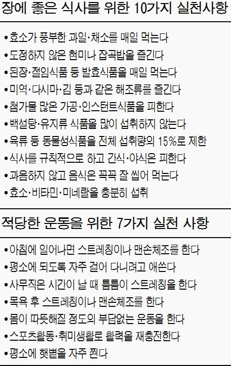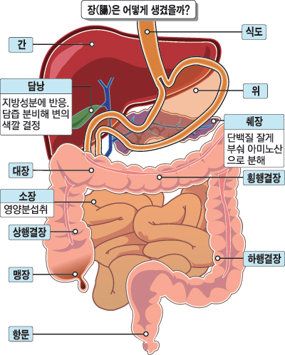 ◆ 음식물은 24~48시간 장에 머물며 배출 = 우리가 매일 먹는 음식물은 목구멍, 식도, 위, 소장(십이지장→공장→회장으로 구성), 대장(맹장→상행결장→간만곡부→횡행결장→비만곡부→하행결장→에스(S)결장→직장으로 구성), 항문을 거쳐 딱딱한 대변으로 배출된다. 음식물이 입에서 대장 끝부분인 에스(S)결장까지 도달하는 데 대략 12~15시간 걸린다. S결장에 도달한 대변은 곧바로 배출되는 것이 아니라 일정 시간 머물러 있다가 24~48시간 후 실제 배변이 이뤄진다.