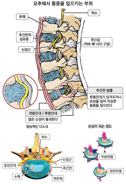 척추뼈 사이사이에는 몸의 하중과 충격을 흡수하는 완충지대인 물렁한 디스크(추간판)가 있다.